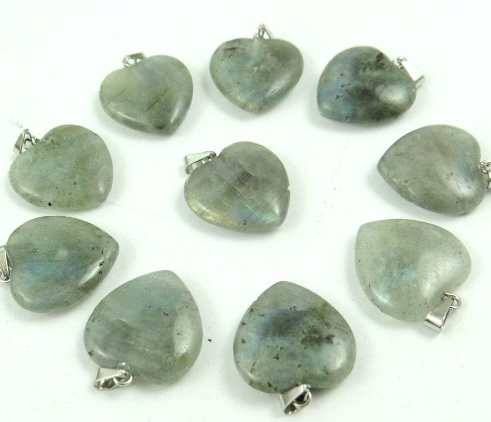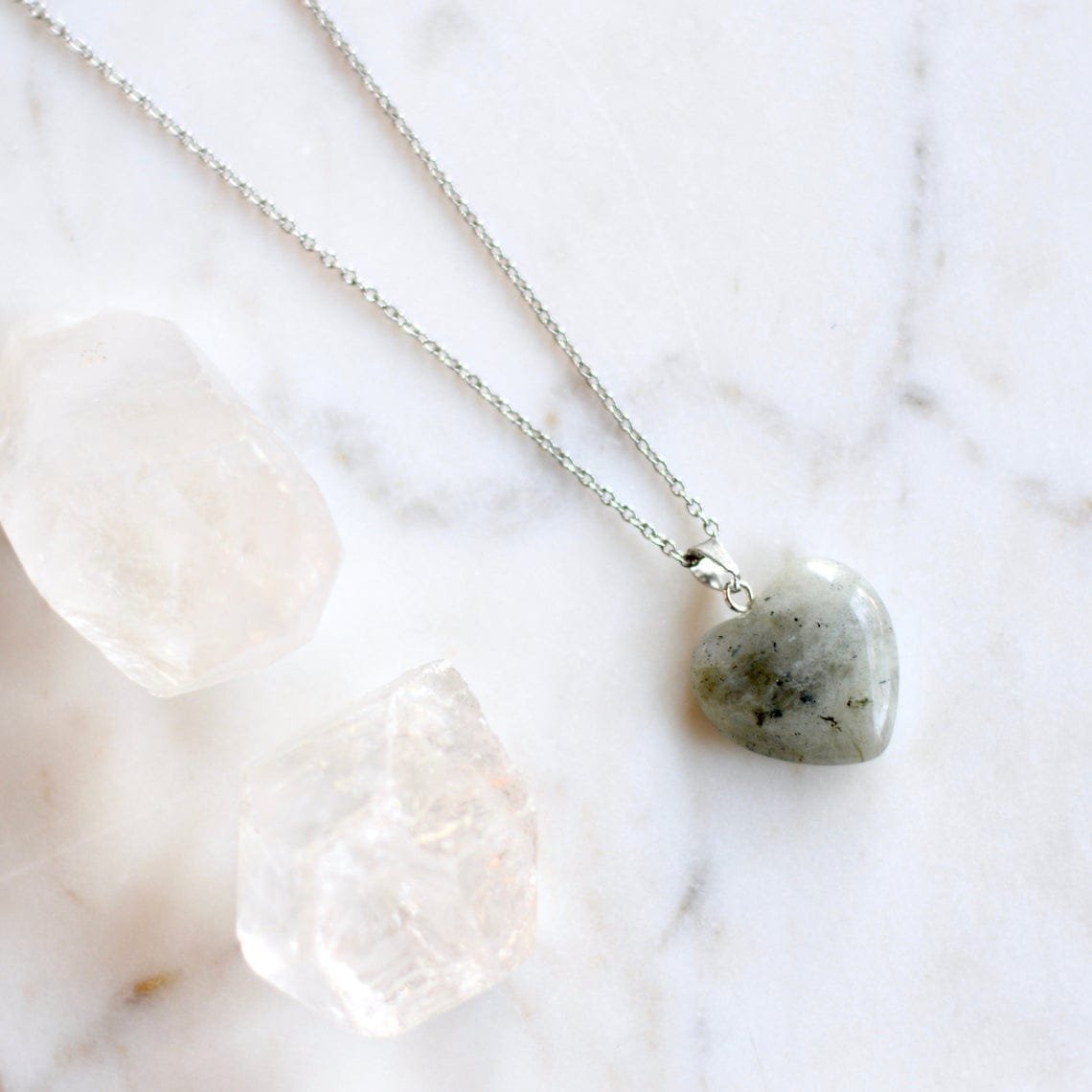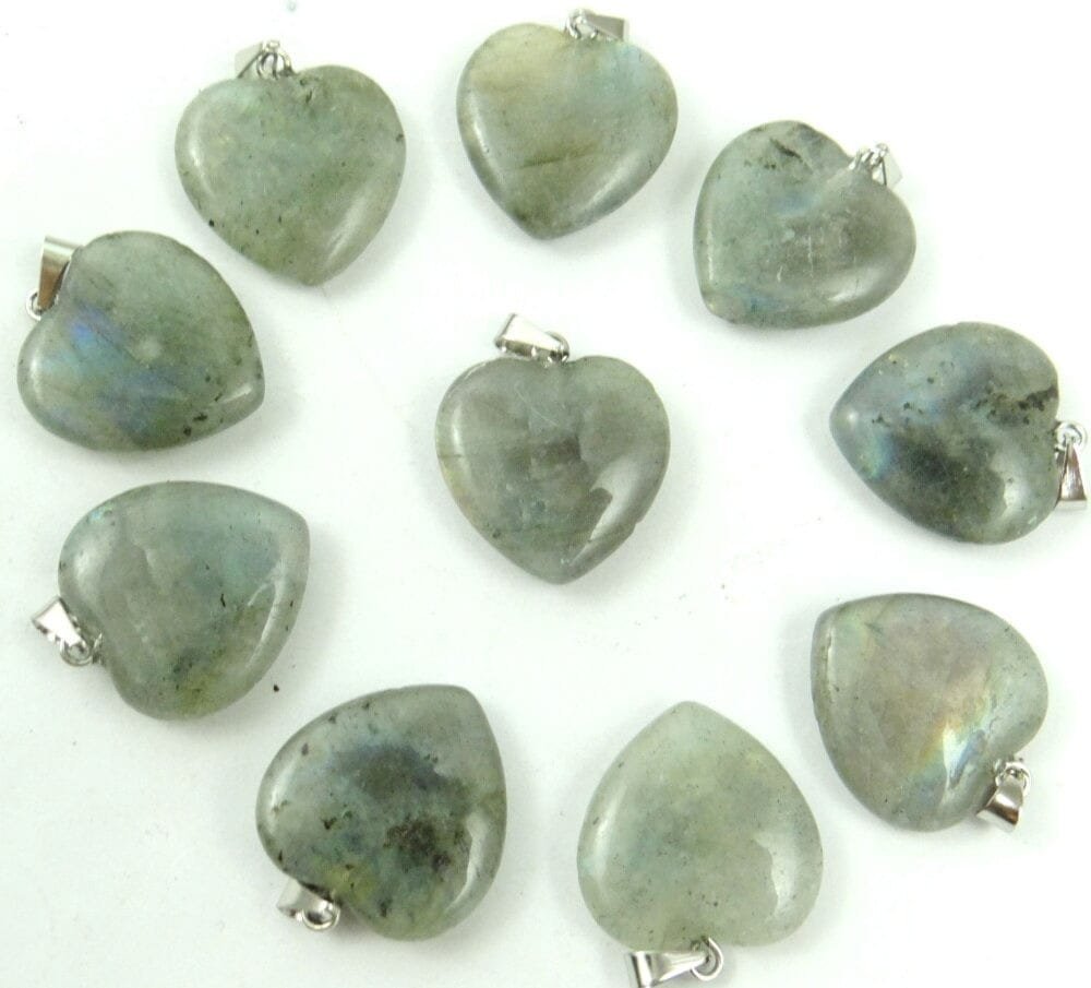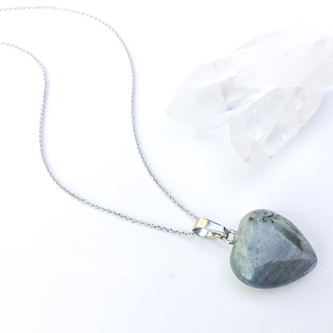Collar Corazon Labradorita. Este mineral  tiene la capacidad de sacar los talentos a la superficie, es decir es excelente para despertar la conciencia del espíritu interior, las habilidades psíquicas y la intuición, ayuda a autodescubrirse. Estas gemas tipo arcoíris aportan bienestar y energías, además armonizan todos los chacras. Las energías negativas del cuerpo son desviadas por esta mágica piedra.
