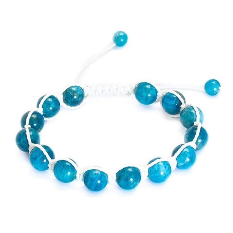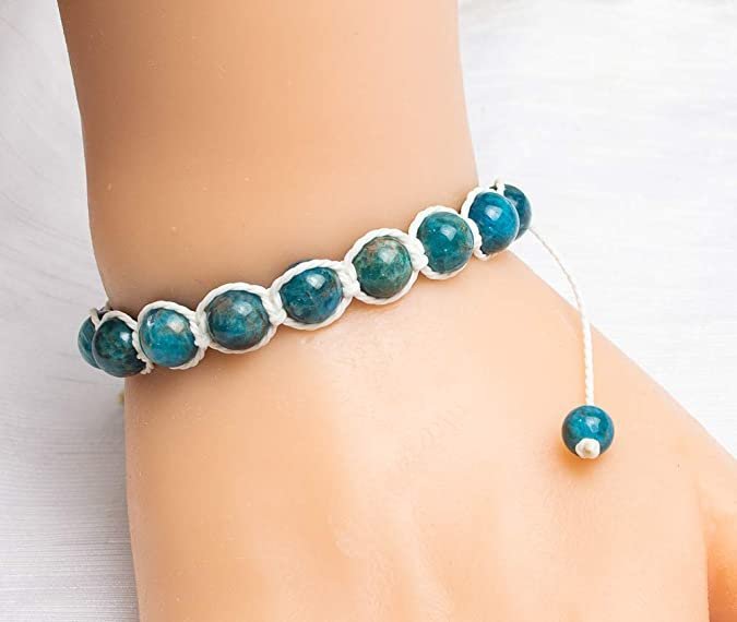 Pulsera Apatita Hilo Blanco. Apatita o apatito, su nombre deriva de la palabra griega “Apate”, y su significado es confundirse. Este mineral fue nombrado así por A.G.Werner en 1786, ya que estudiando esta gema, logró comprobar que se trataba de un nuevo mineral que hasta ese entonces se había confundido con otros que eran muy similares como el berilo o turmalina.
