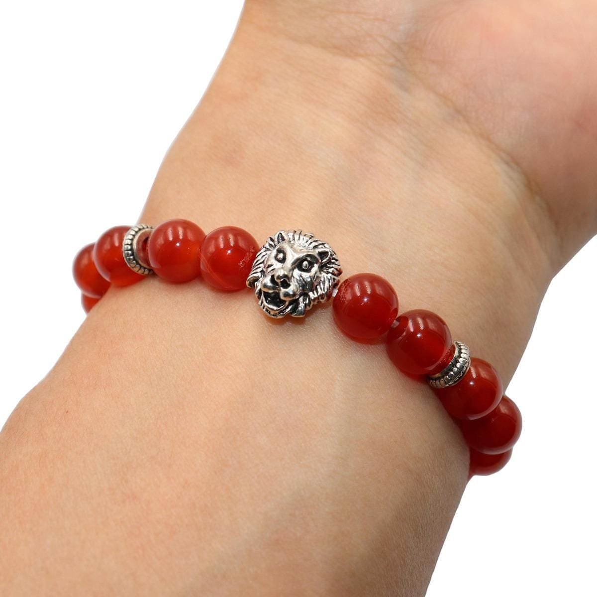 1 manilla de piedra natural en cuentas de 8mm de Cornalina, con separador central de león en plata tibetana, y 2 separadores laterales en plata tibetana (su estilo puede variar)