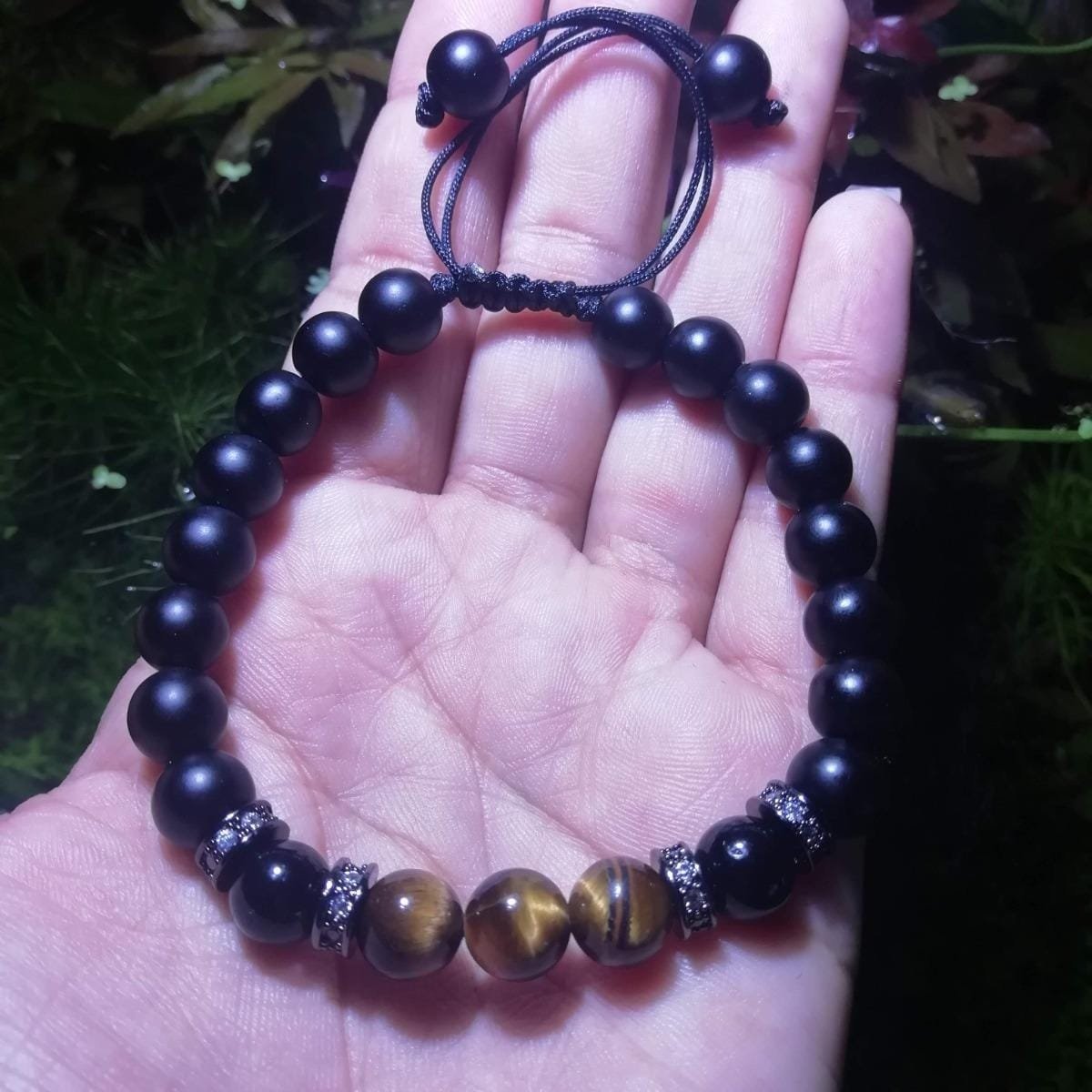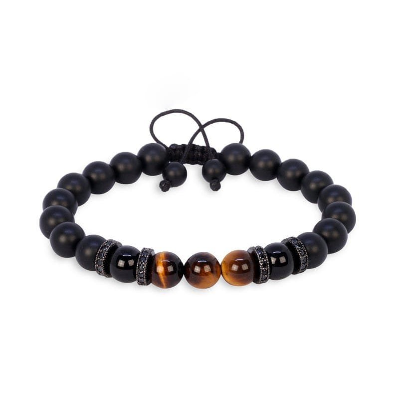 1 Manilla de piedra natural ojo de tigre cafe dorado, con Turmalina Negra y onix negro mate 8mm
